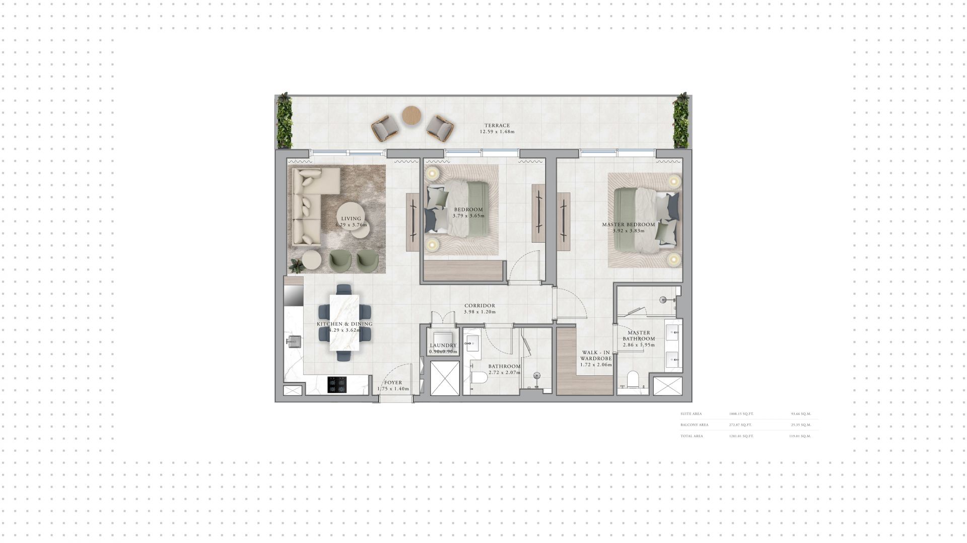 An apartment with 2 bedrooms in the complex Club Place. The apartment with an area of 1 281 ft² is located on the 0 of 20, finished. Windows: panoramic. Delivery of the project is scheduled for the 4st st quarter of 2028.
