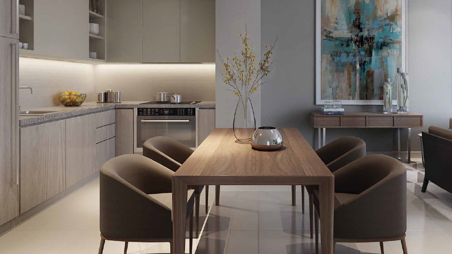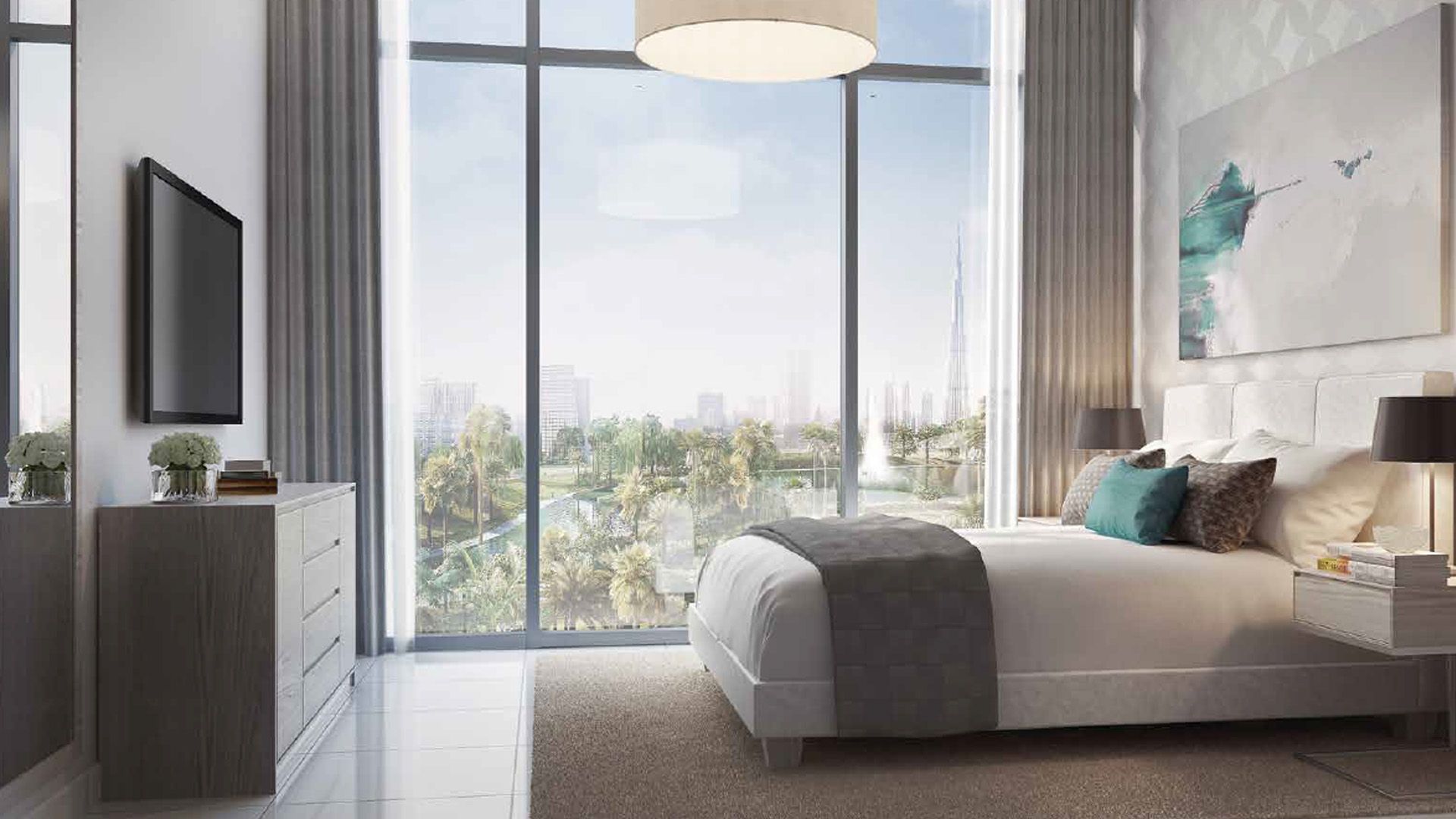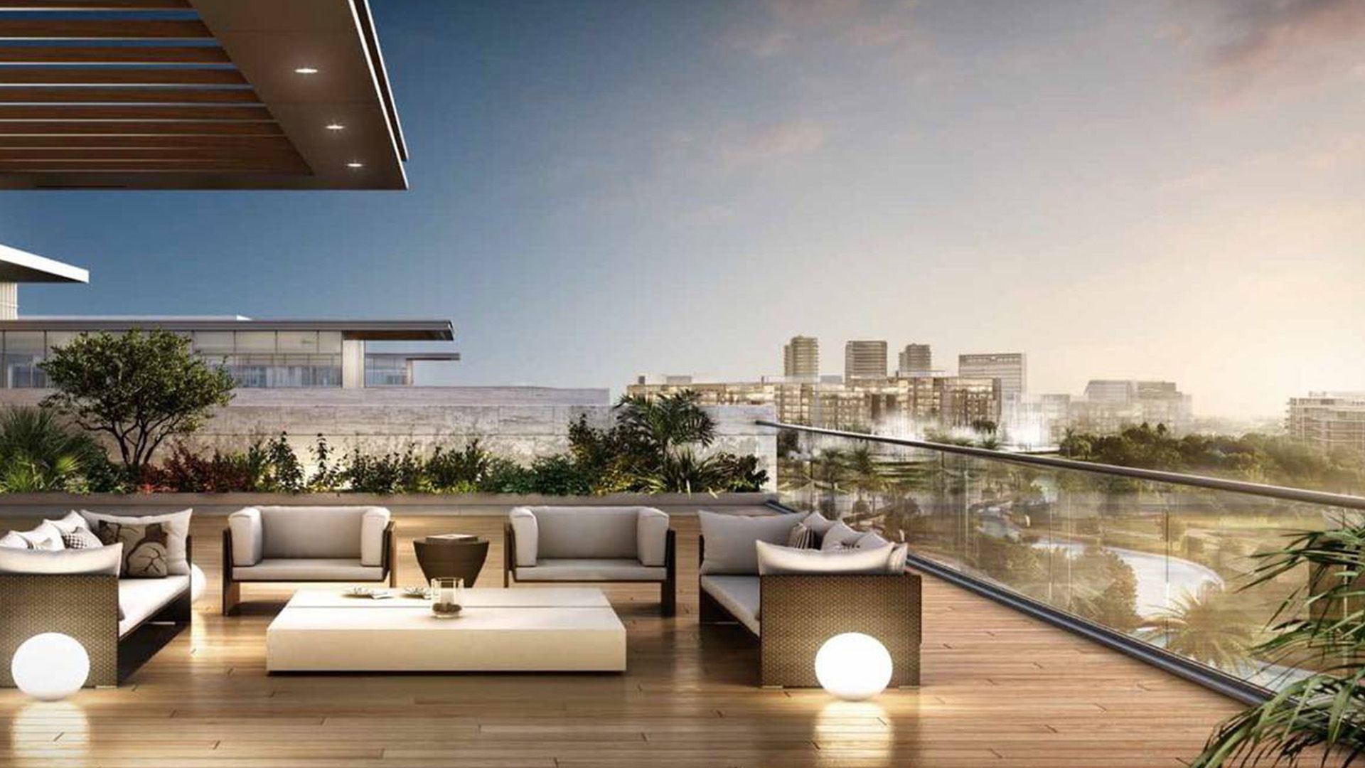 Three buildings form a private courtyard with a pool and sun loungers. The 1–4BR homes feature modern finishes, minimalist interiors and panoramic windows overlooking city landmarks and the lush Dubai Hills Park. Residents enjoy direct access to sports courts, running and cycling tracks, playgrounds, schools, medical centres, retail and the nearby golf club.